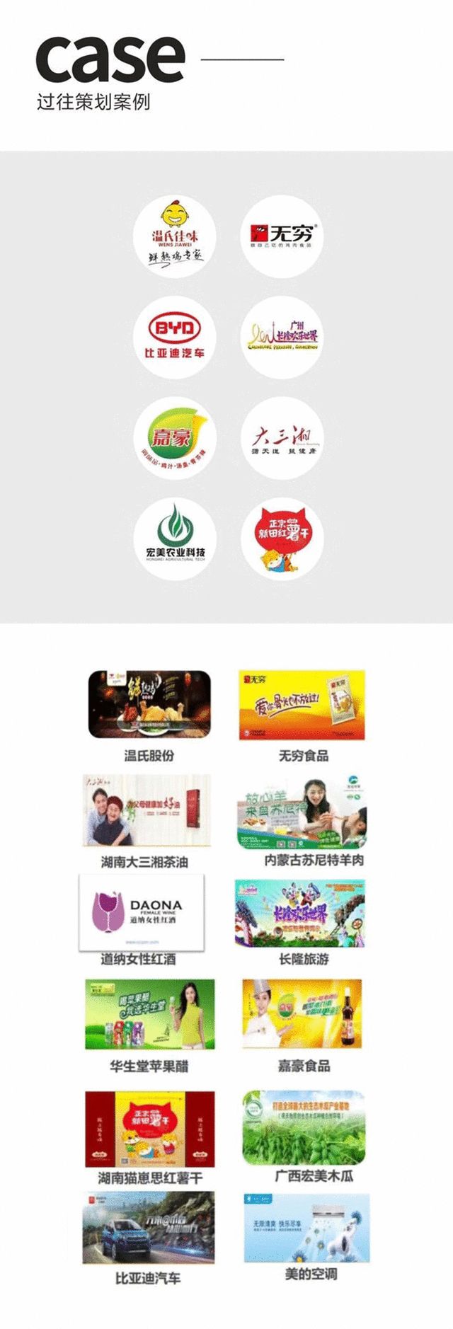 服務(wù)企業(yè)100多家,包含千億企業(yè)溫氏,百億企業(yè)比亞迪,無窮食品 等100多家企業(yè)和城市,區(qū)域,農(nóng)特產(chǎn)品策劃,常年為企業(yè)策劃 咨詢 顧問 演講 培訓(xùn) 。